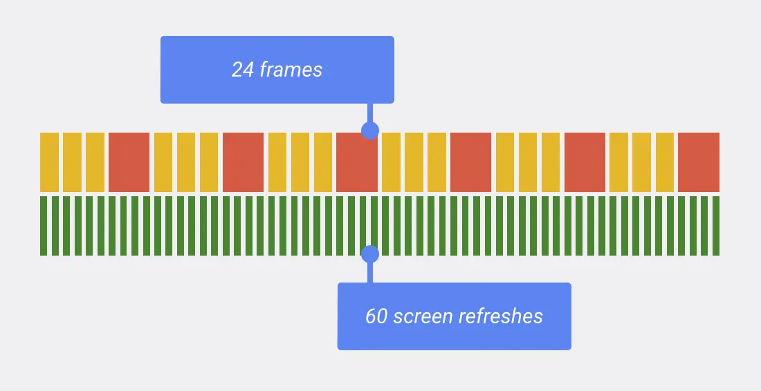 What does it mean? It means that your screen constantly draws a new image at 1/60 of a second, regardless of what you feed him. If you're a close observer, you notice that 60 doesn't evenly divide by 24. That's a pretty significant problem, as running a movie with 24 fps on a 60 Hz screen will cause the screen to draw a few frames twice, in an irregular way that is extremely noticeable. A camera pan that was smooth in a movie theater will thus look super choppy on your screen.