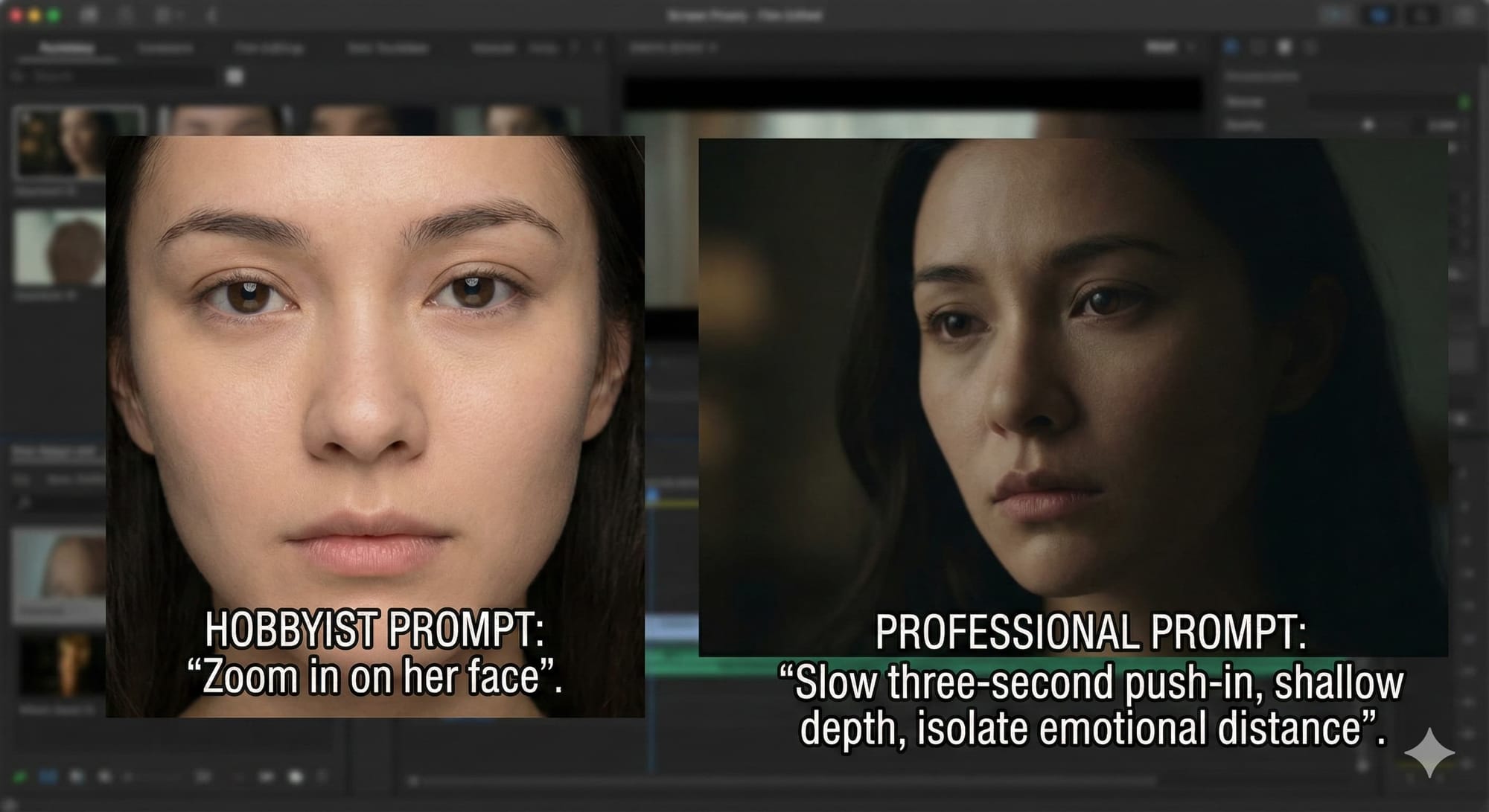 “Give me a slow, three-second push-in for emotional isolation. Depth at f/2.0. Let the background collapse.”
